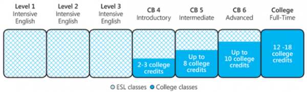 College Bridge 및 모든 대학수준 프로그램 College Bridge (CB) 프로그램은 대학 진학을 계획하고 있지만 영어 실력을 향상시켜야하는 학생들을위한 것입니다. College Bridge는 CB4, CB5 및 CB6의 3 단계로 구성되어 있습니다. 이 프로그램은 상급 수준의 ESL 학생들이 풀 타임 대학 수업의 1/4에 해당하는 13 학점까지 영어 실력을 개발할 수 있도록합니다.