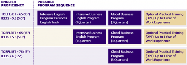 •International Business Certificate Sequence 국제 비즈니스 인증서 시퀀스 아래 차트는 영어 실력 수준에 따라 많은 학생들이 도움이되는 국제 비즈니스 프로그램의 제안 순서를 보여줍니다. 글로벌 비즈니스 프로그램 (Global Business Program)을 마친 학생들은 이민 상담 페이지 의 취업 섹션을 읽어 옵션 실무 교육 (OPT)을 신청할 수 있습니다 .