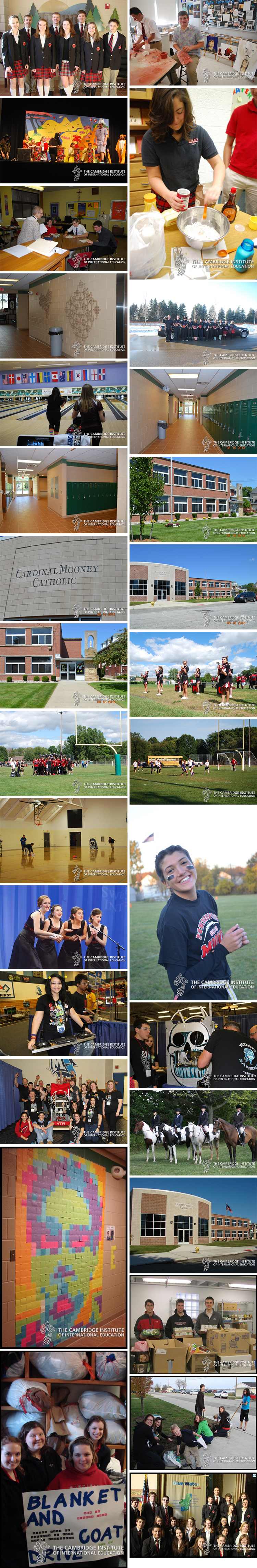 Cardinal Mooney Catholic High School은 Michigan 주의 남부지역인 Marine City의 “Blue Water Area”에 위치합니다. 디트로이트에서 45분 거리이고, 캐나다와 근접하여 날씨가 좋을때는 학교에서 캐나다 국경이 보기이도 합니다. 학업 프로그램으로는 6개의 AP 과목, 12개의 Honors 과목을 제공합니다. 그리고 STEM 집중수업이 있습니다. 물리 수업을 듣는 학생들은 STEM Expo에 참여하고, 2012년 과학 수업에서는 각자의 망원경을 만들기도 하였습니다. 또한 Michigan Technological University와 파트너십을 통해 많은 프로젝트에 참여할 수 있습니다. 학교는 국제 학생들을 위해 국제학생 학업 지원 프로그램을 제공합니다. 프로그램은 고급 레벨의 학생들을 위한 대학 에세이 작문과 TOEFL, SAT, ACT 시험준비를 포함하여 모든 레벨의 학생들에게 제공됩니다. 1:1 또는 그룹으로 경험많은 교직원이 학생들의 학업 성취와 대학 진학의 전망을 올리기 위해 학생들에게 추가 도움을 주고 있습니다. 과목에 특화된 교직원과 함께 진행되는 평가, 지원 및 상담은 학생들의 노력을 이해하고, 학생들 개개인이 필요한 부분을 돕습니다. 또한 특정 과목의 과외 수업도 가능합니다. 경우에 따라 최상위 또는 최하위 학생들에게 유료로 튜터링을 제공합니다. 특별활동으로는 13개의 클럽, 특별활동, 11개의 스포츠 활동에 참여할 수 있습니다. Michigan Tech Enterprise Club은 클럽활동을 통해 여러분야에 걸친 활동을 할 수 있습니다. 회사 프로젝트와 같이 실제 클라이언트가 있다는 가정으로 진행되며, 혁신적인 제품과 해결책을 얻을 수 있도록 연구합니다. 이를 통해 학생들은 테크니컬 적인 분야에서 전문적인 경험을 얻을 수 있습니다. 최근에는 개발 도상국에서 사용할 수 있는 유아 심장 표시기를 테스트하기 위해 가나로 견학을 가기도 했습니다. 과거에는 GM, 미국 환경부, 3M 등과 협력하기도 했습니다. FIRST Robotics Team은 매년 National Robotics Association (50,000이 넘는 학생들이 참여하는 협회)에 참가하며, 70kg가 넘는 로봇 모듈을 제작했습니다. SAT 평균점수는 1636점, 상위 30%는 1890점, 상위 10%는 2070점이며 졸업생이 진학한 대학은 다음과 같습니다. University of California at Los Angeles, University of Michigan, Georgia Institute of Technology, University of Illinois, University of Texas at Austin, University of Washington. |